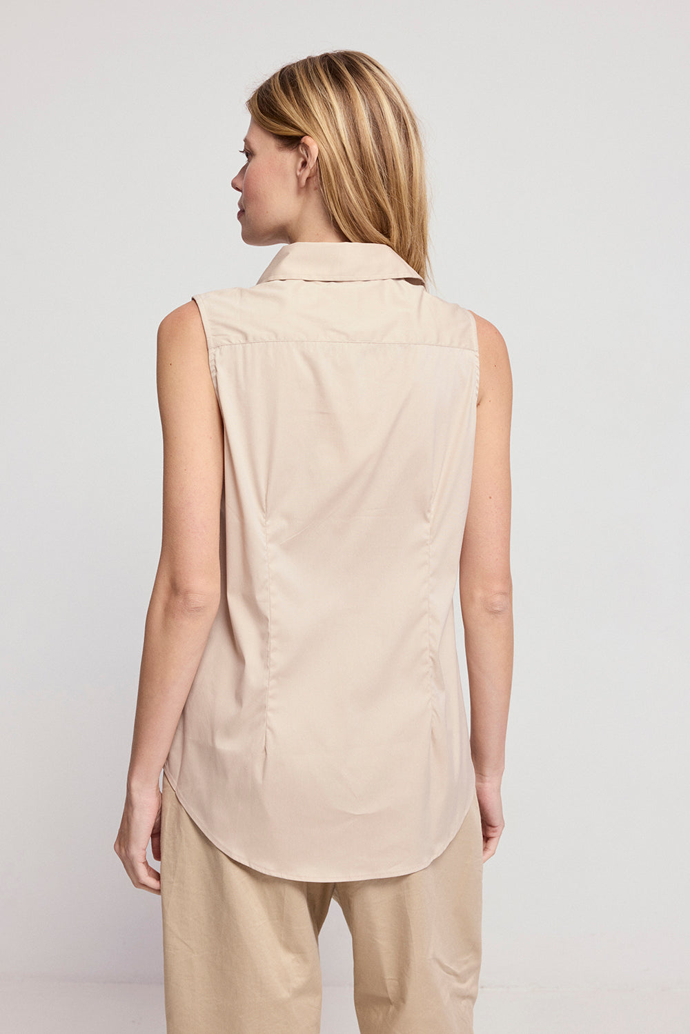 Our warm weather cotton staple. The Sleeveless Shirt is a classic for layering or to wear on its own.   Narrow armholes mean bra won't peek through the side (and won't peek through the front either).