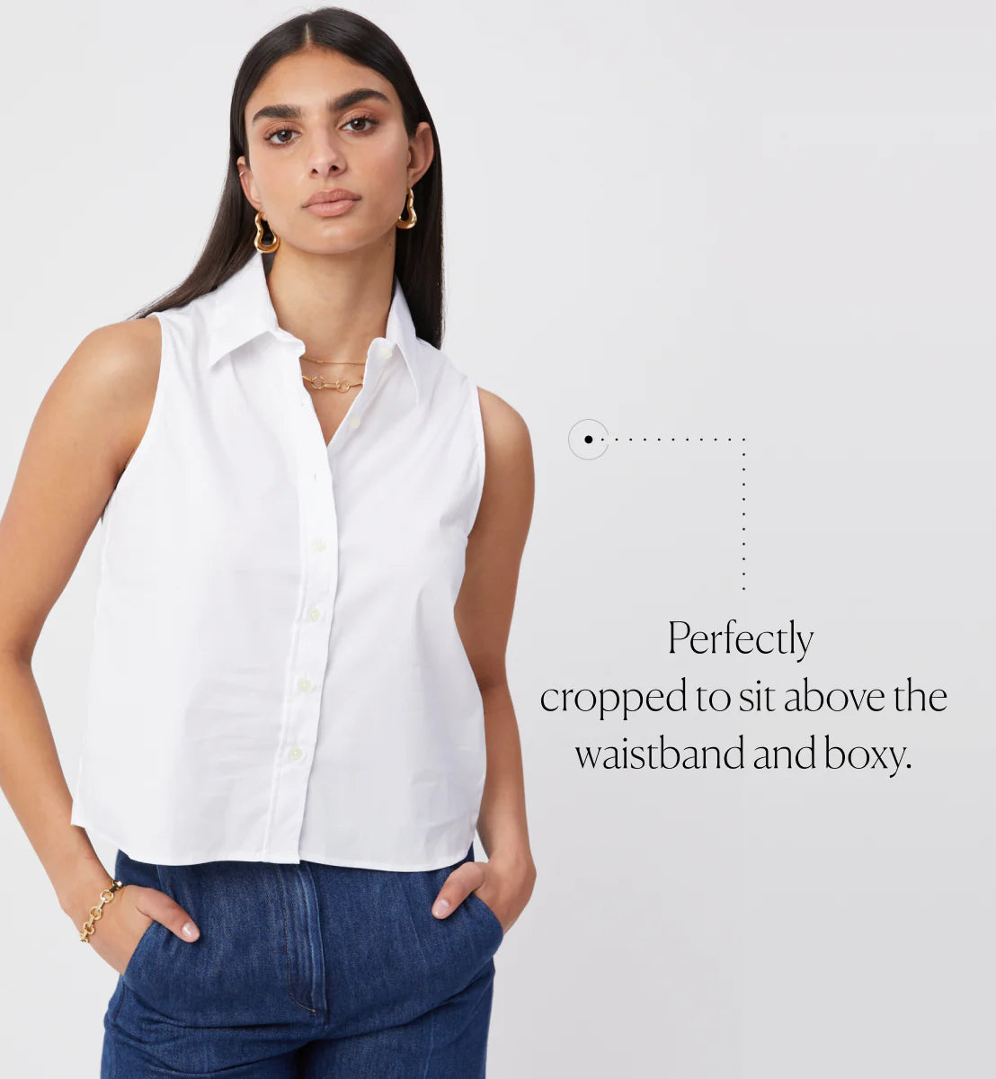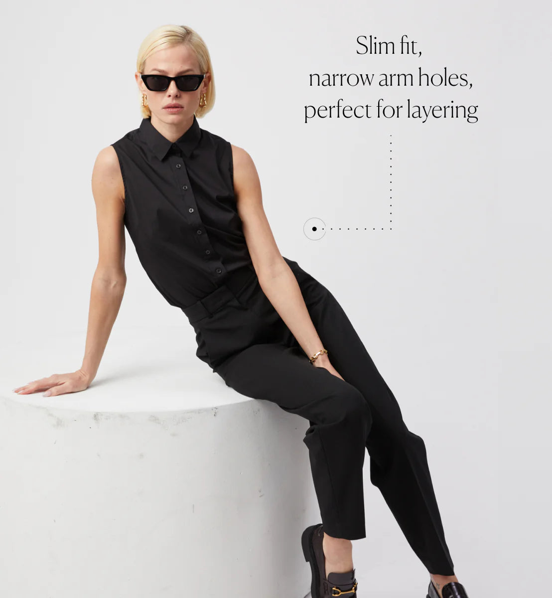 Our warm weather cotton staple. The Sleeveless Shirt is a classic for layering or to wear on its own. Narrow armholes mean bra won't peek through the side (and won't peek through the front either).