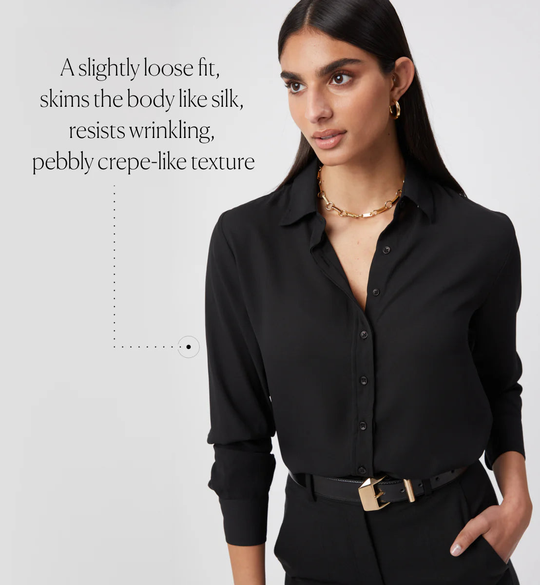 Tailored yet languid. The Signature Shirt in our drapey fabric is the gold standard for luxe simplicity. This fabric has a crepe-like pebbly texture and resists wrinkling. The Signature Shirt is a slightly loose fit, in the way a silk shirt would skim the body.