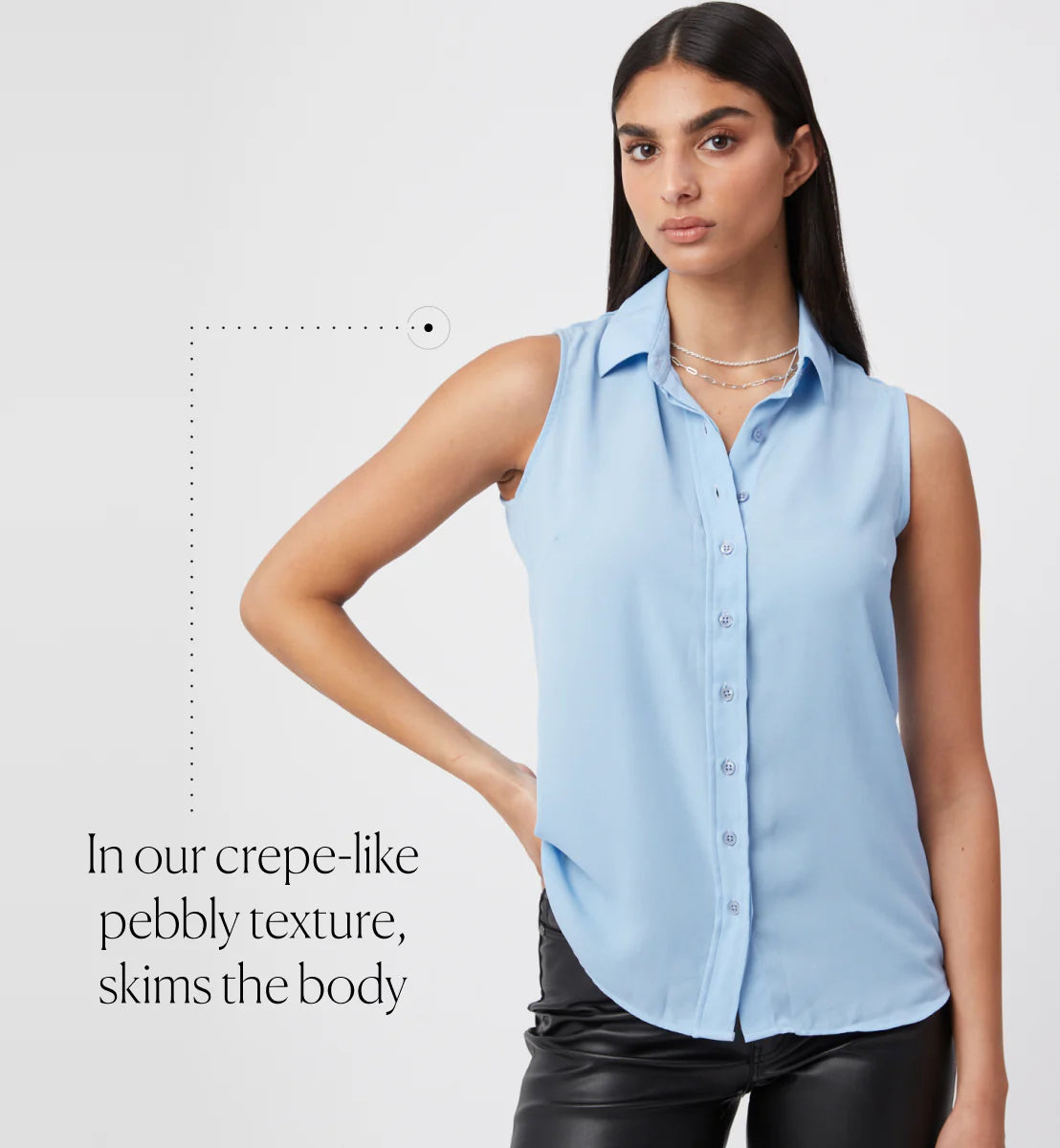 Our warm weather staple. The Signature Sleeveless Shirt is a classic for layering or to wear on its own. Narrow armholes mean bra won't peek through the side (and won't peek through the front either). This fabric has a crepe-like pebbly texture and resists wrinkling.