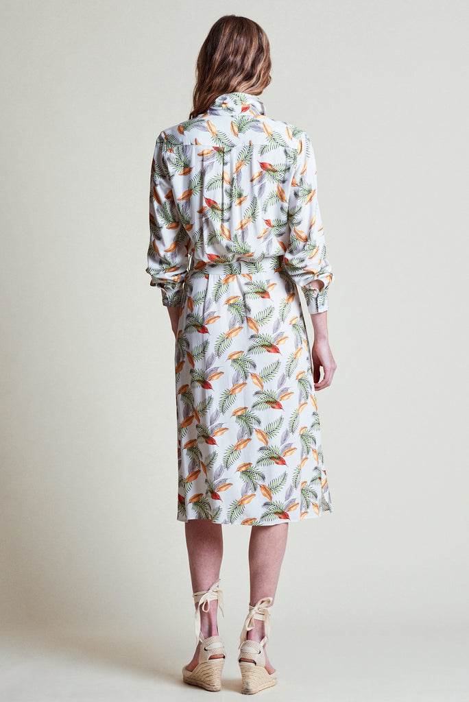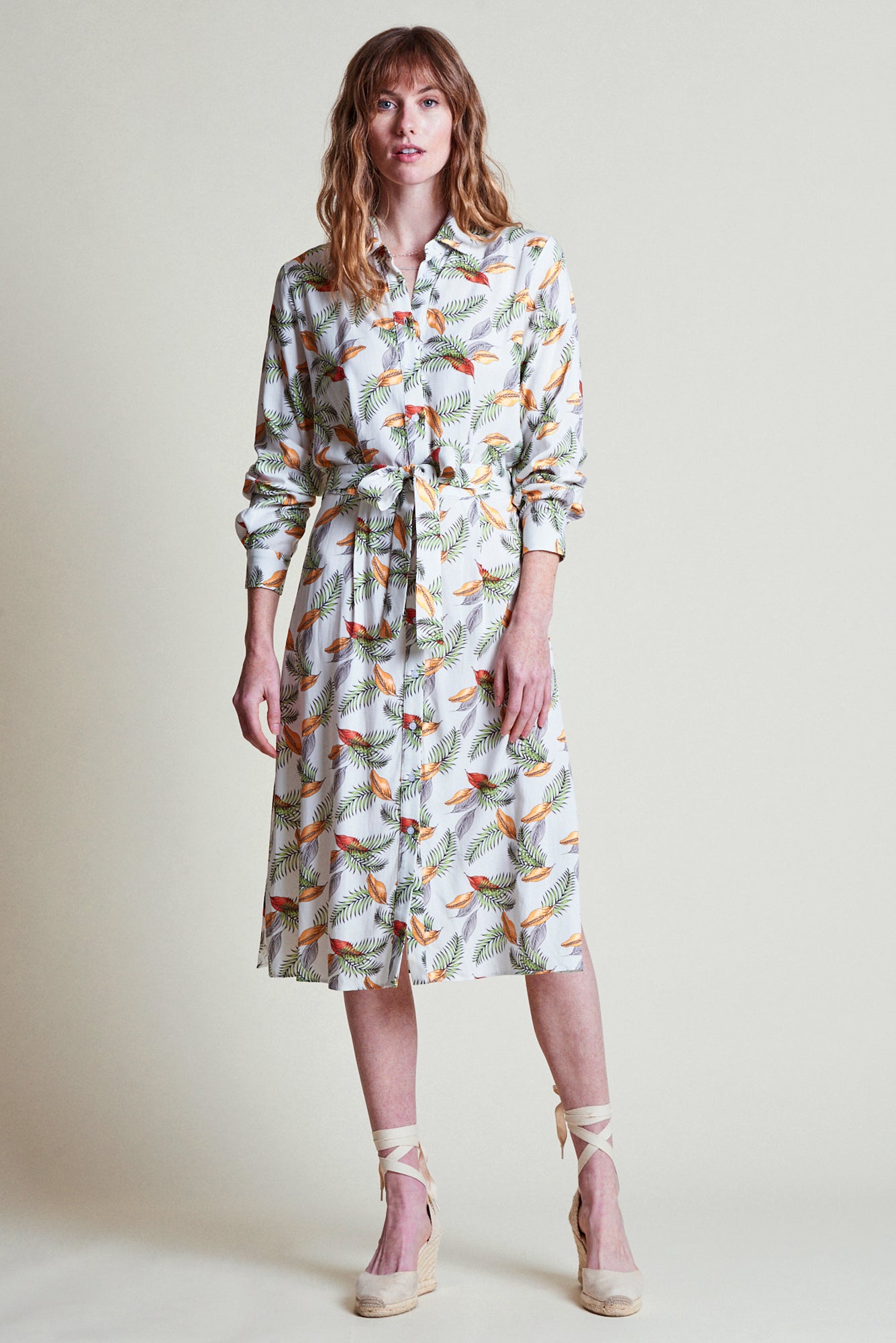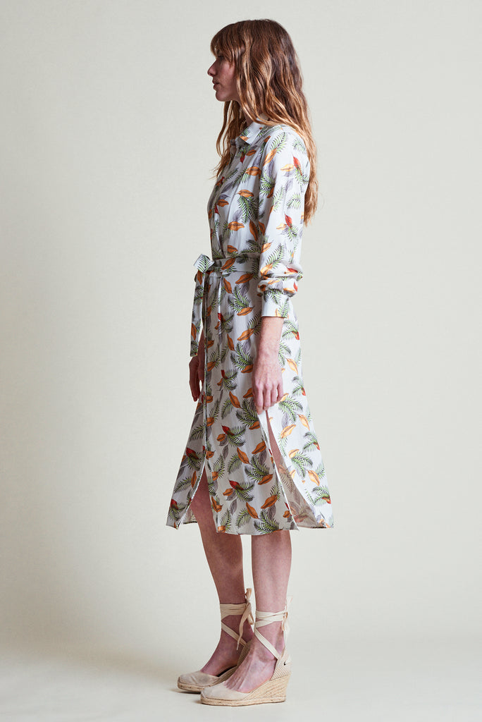 Our easy-to-throw-on-yet-look-perfectly-put-together dress. With a fun, playful print, silky soft fabric, and slits on either side of the leg, we love this look casually with flat metallic sandals.